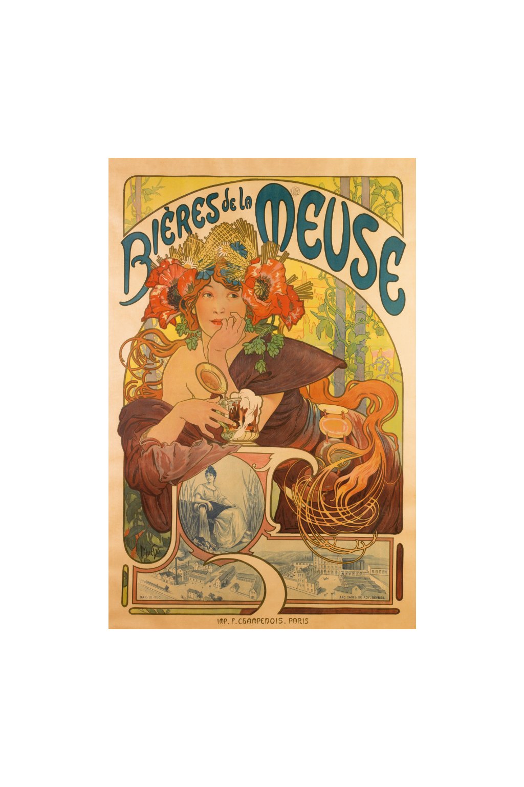 This large format poster portrays a woman with a wreath of poppies, wheat and hops in her hair holding a pint of beer. She has Slavic features and is reminiscent of the figure of Summer from Mucha's Seasons series made in the previous year.