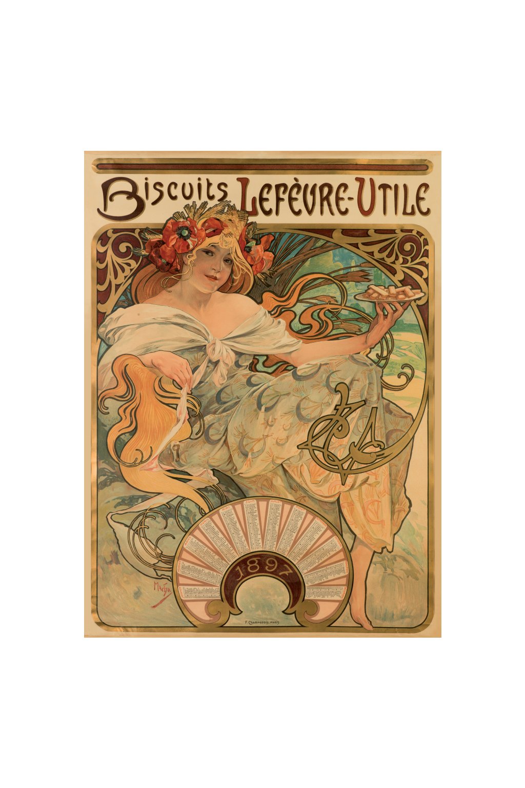 One of Mucha’s most personable young ladies, her hair cascading irrepressibly in one style, is offering a dish of wafers. The design of the girl’s dress incorporates sickle and wheat emblems, appropriate to the subject.