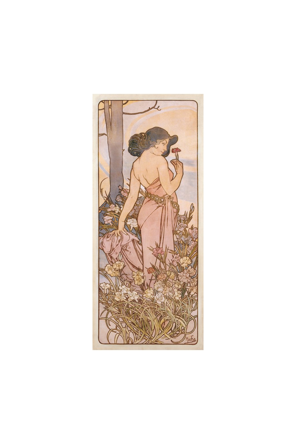 For this cycle, Mucha selected a more naturalistic approach, demonstrating his sensitive and attentive observation skills in rendering the flowers’ characteristics. The original watercolours of two of the flowers, Carnation and Iris, were presented at the Mucha Exhibition in Salon de Cent in June 1897, however, the entire cycle was not available until the following year.