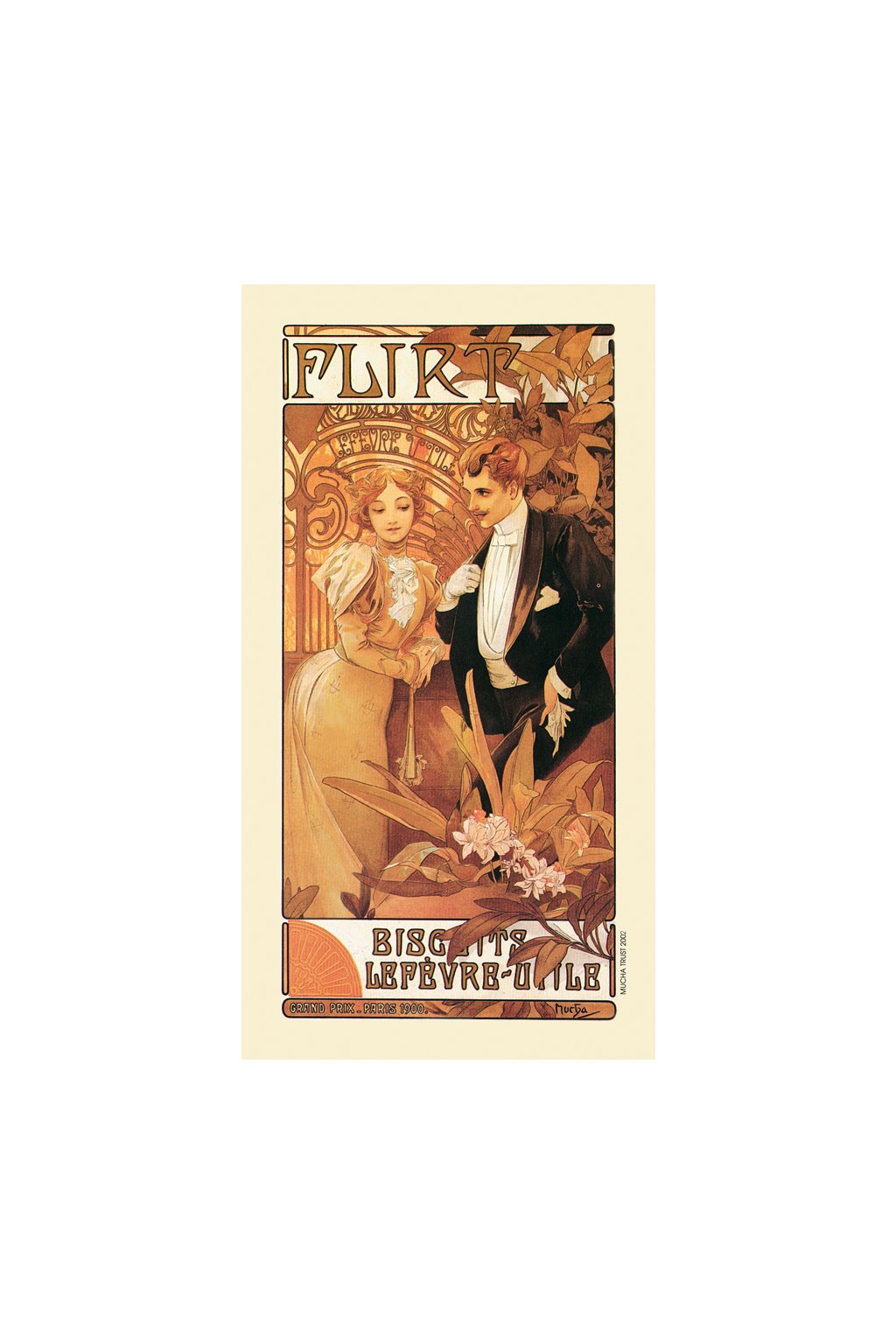 The Flirt is a classic example of his Art Nouveau style, featuring a graceful woman with flowing hair framed by ornate floral and decorative motifs. The poster blends soft pastel tones and elegant curves, capturing a sense of romantic allure and refined beauty that epitomizes Mucha’s turn-of-the-century ideal of femininity.