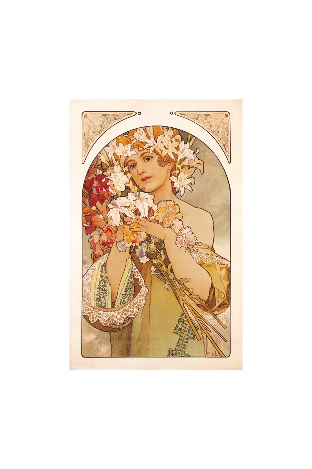 Flower portrays a serene young woman adorned with blossoms, her flowing hair and delicate pose embodying the natural beauty and harmony central to the Art Nouveau style.