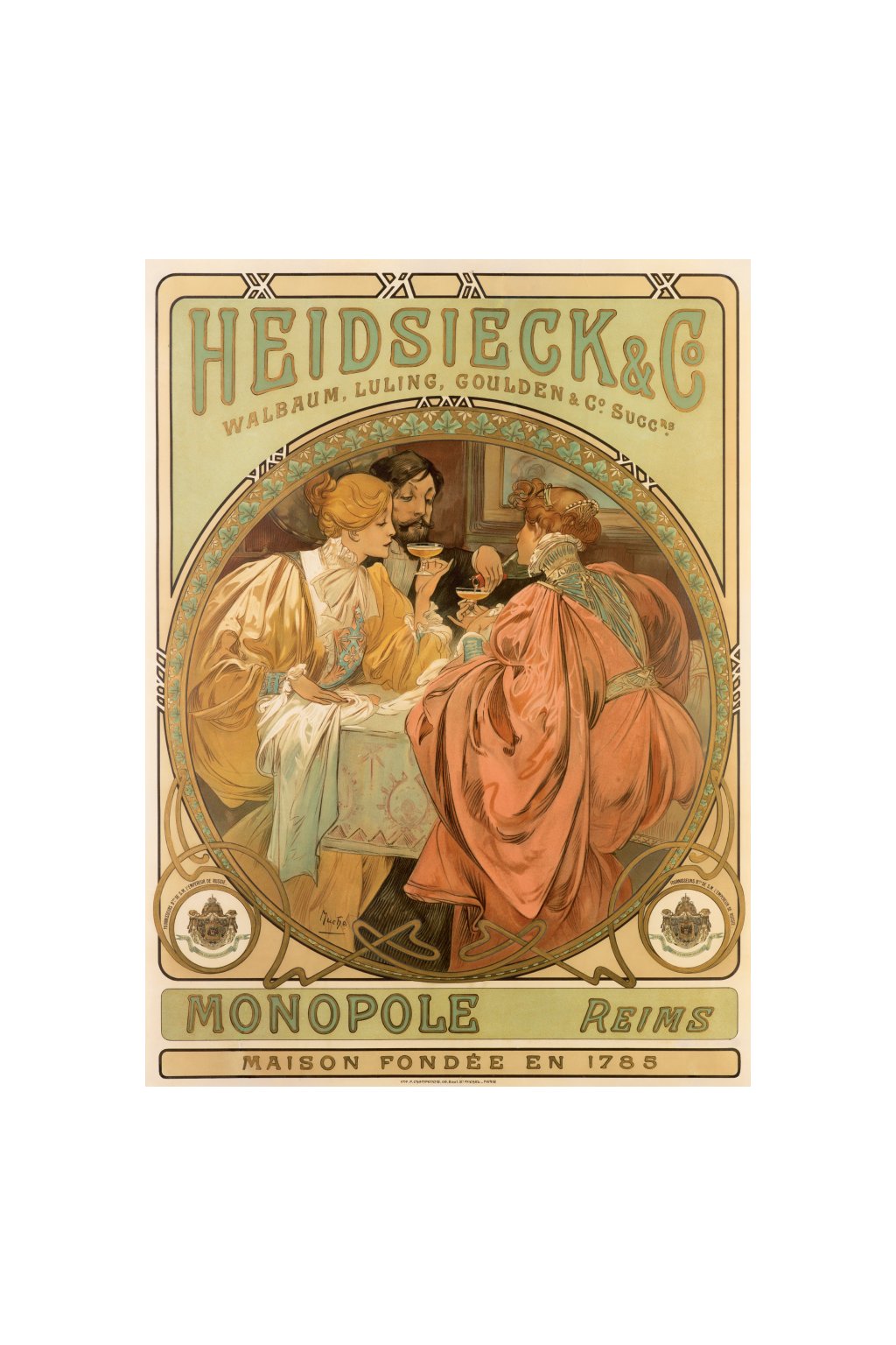 For this famous brand of Champagne, Mucha created a convivial scene with two young ladies and a bearded gentleman in high society regalia.