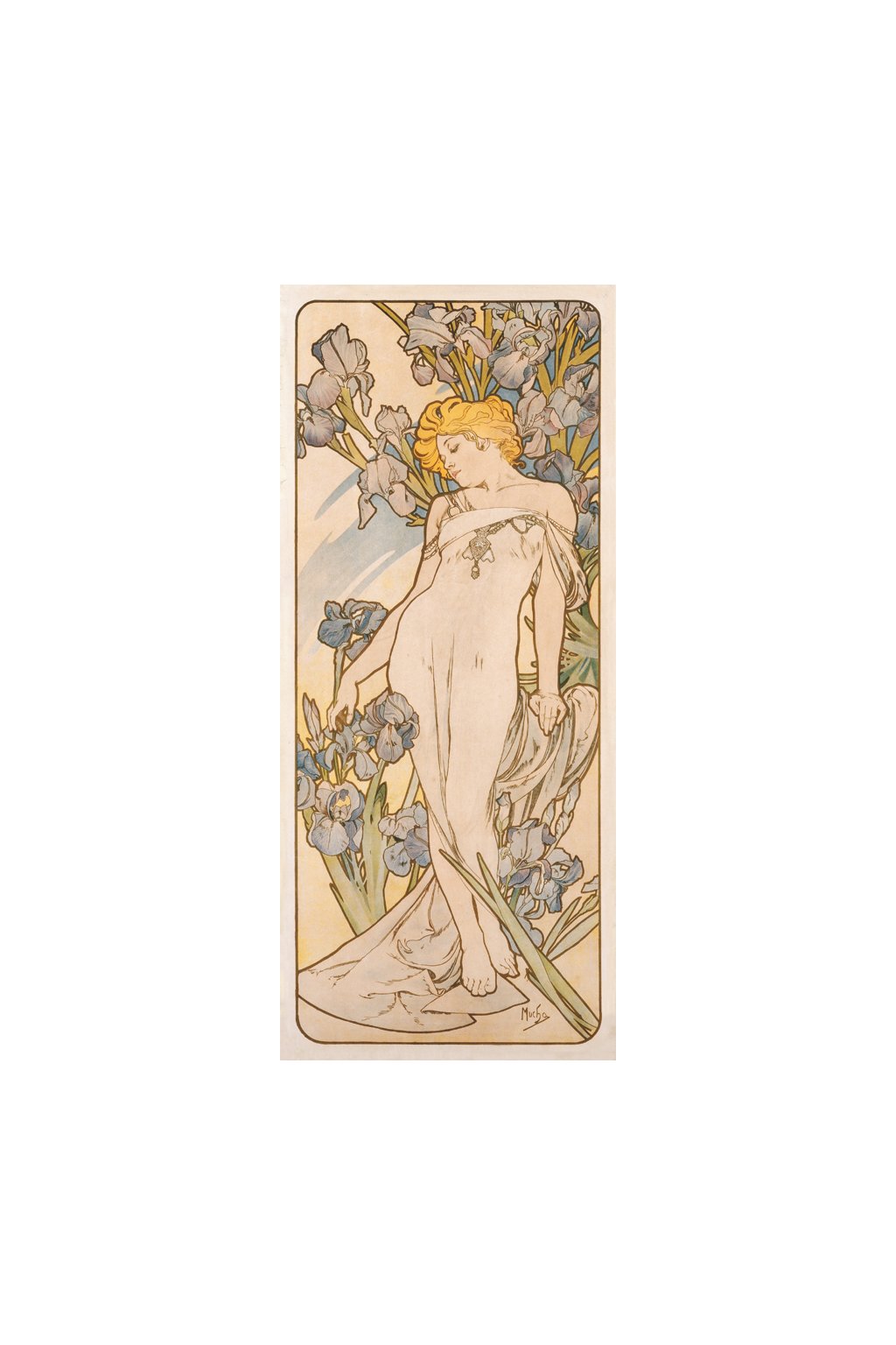 For this cycle, Mucha selected a more naturalistic approach, demonstrating his sensitive and attentive observation skills in rendering the flowers’ characteristics. The original watercolours of two of the flowers, Carnation and Iris, were presented at the Mucha Exhibition in Salon de Cent in June 1897, however, the entire cycle was not available until the following year.