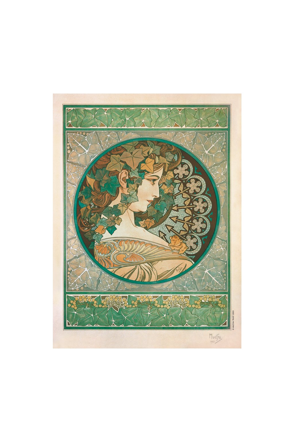 This panel recalls the poster Mucha designed for the dancer Lygie the same year and may well have been inspired by her. The decorative ivy foliage transforms the circular frame into a rectangle. Both Ivy and its companion piece Laurel were later produced as decorative metal plates.