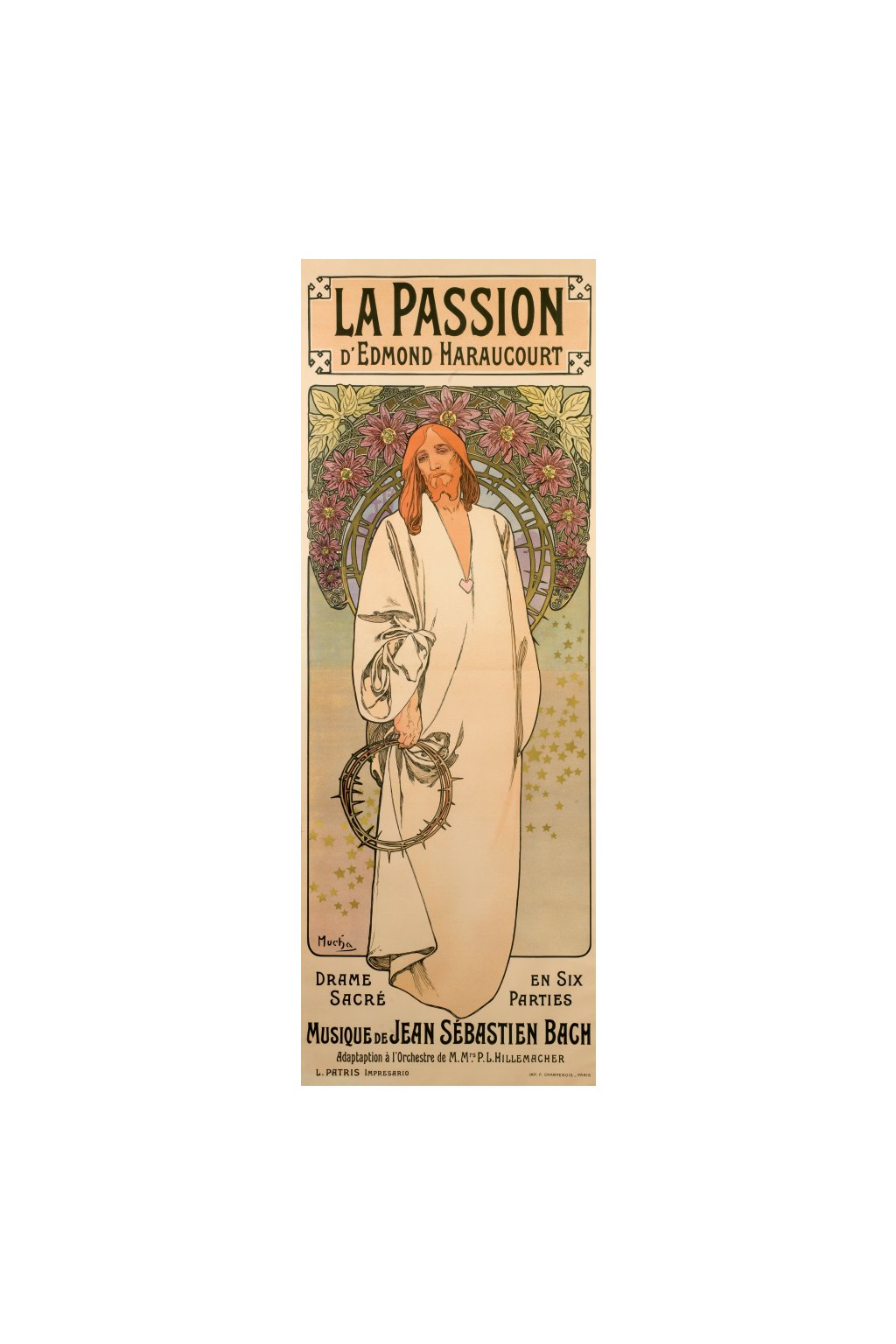 Mucha, brought up in an atmosphere of intense religious fervour, felt at home with sacred motifs and was adept at expressing himself through them. For Haraucourt’s La Passion, he created one of the most compassionate portraits of Christ, frail and unabashedly human, his eyes asking not for pity as much as for understanding. The usual circular pattern in the background is provided by the crown of thorns, within which may be seen the three crosses of the Calvary at his right shoulder, and the Omar Mosque in Jerusalem at his left shoulder. This was the last poster he created in Paris, just before leaving for the United States. It is fitting that the first one (Gismonda) was also based on a religious theme.