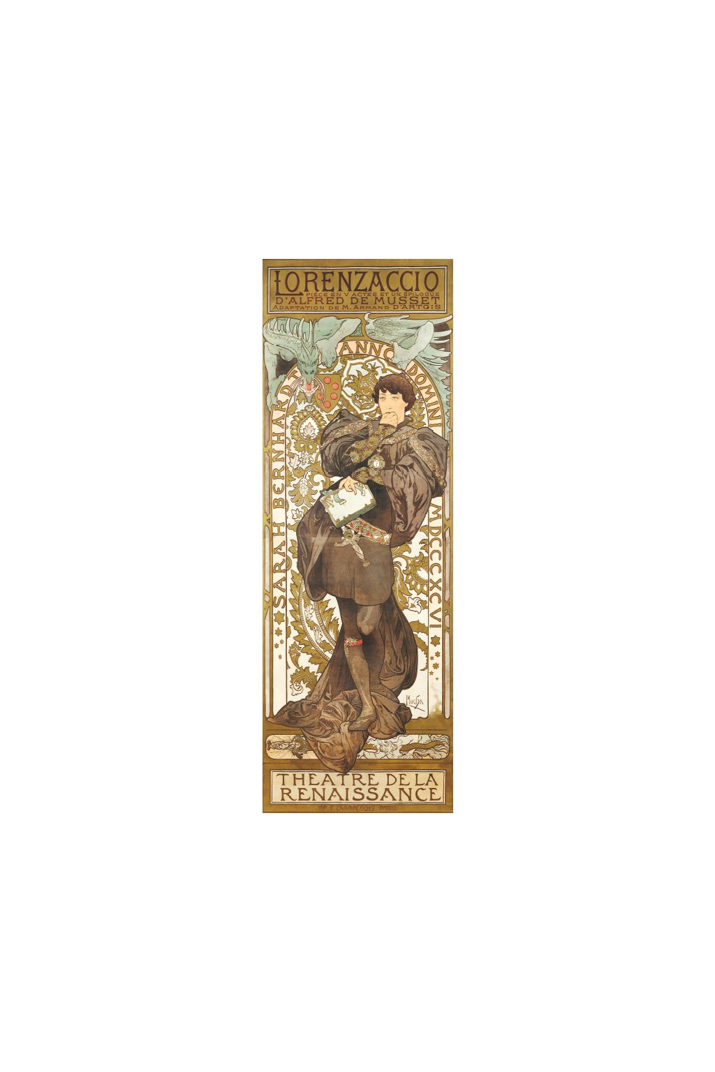 In Alfred de Musset’s play Lorenzaccio, Sarah Bernhardt played the male hero, Lorenzo de’ Medici, at the time of the siege of Florence by the tyrant Duke Alexander, who is symbolically rendered as a dragon menacing the Florentine coat of arms. Lorenzo contemplates the murder of Alexander, which is depicted in the bottom segment of the poster.