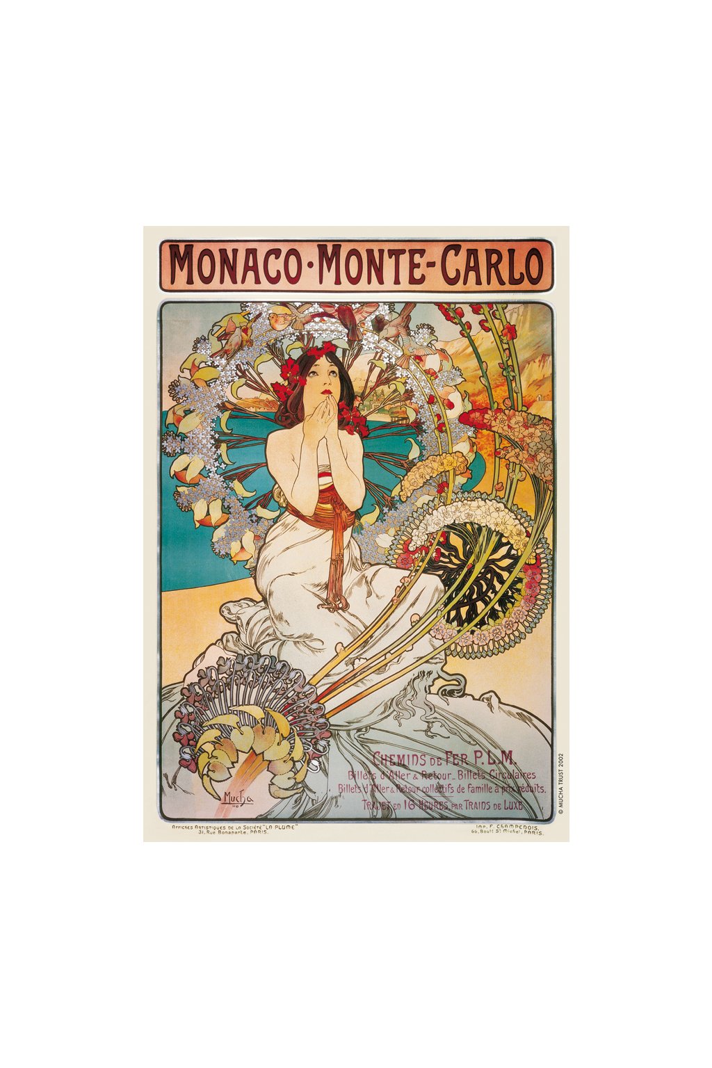 The pale female figure at the centre of the poster holds her hands to her face in wonder against a backdrop of blue sea and a mountainous coastline. Her body is surrounded by an elaborate floral pattern composed of curving stalks of lilac, hydrangea, dianthus and violet. In the background, Mucha features the distinctive towers of Monte Carlo's famous casino.