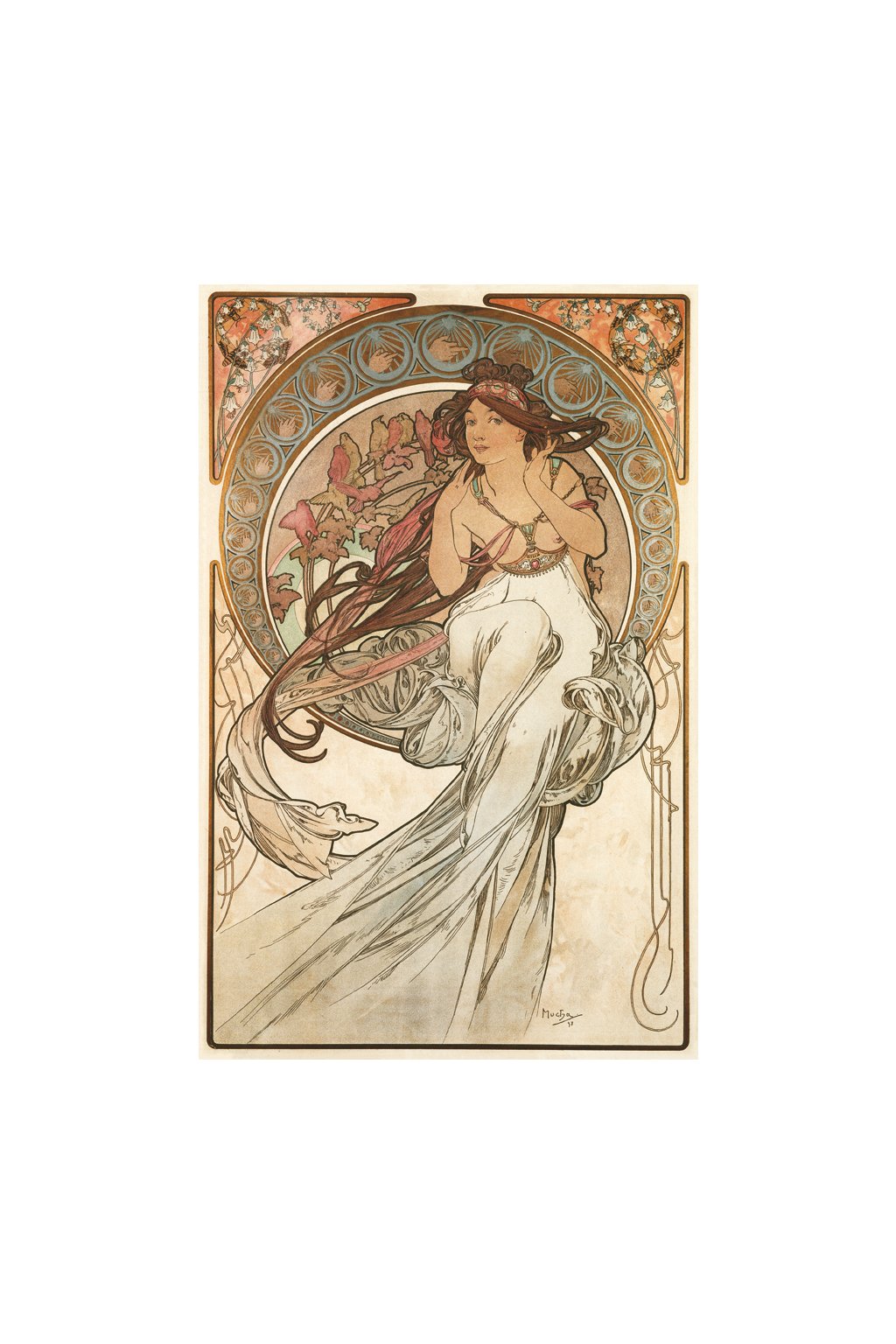 A passionate musician himself, Mucha chose to personify music as a woman with both hands raised to her ears listening to a chorus of nightingales, the most creative and spontaneous of songbirds.