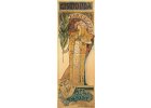 One of Mucha’s most personable young ladies, her hair cascading irrepressibly in one style, is offering a dish of wafers. The design of the girl’s dress incorporates sickle...