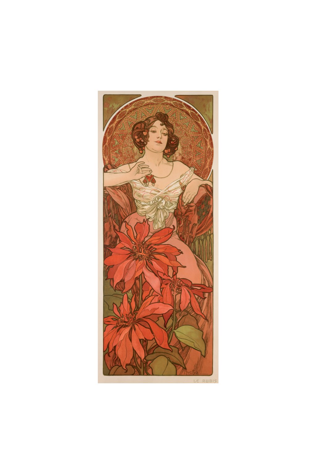 The Ruby artpiece depicts an elegant woman in flowing garments holding a ruby-red gemstone, surrounded by ornate floral patterns and radiant, jewel-like colors that symbolize passion and vitality.