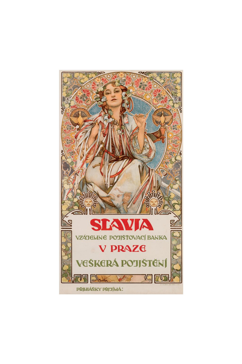 Slavia holds a ring in her hand which symbolizes unity, and there are two stylized peace doves on the armrests of the hidden throne she is sitting on; but just in case, she also has a sword in her lap, the message being that the Slav is peaceful by nature but will fight when attacked. Here, Slavia is merely encouraging you to buy insurance from the Mutual Insurance Bank of Prague. But she has a bright future in store. This was one of Mucha's favourite designs, and was used again on a Czech 100 crowns note issued in 1920, and finally on a stained-glass window for St. Vitus Cathedral.