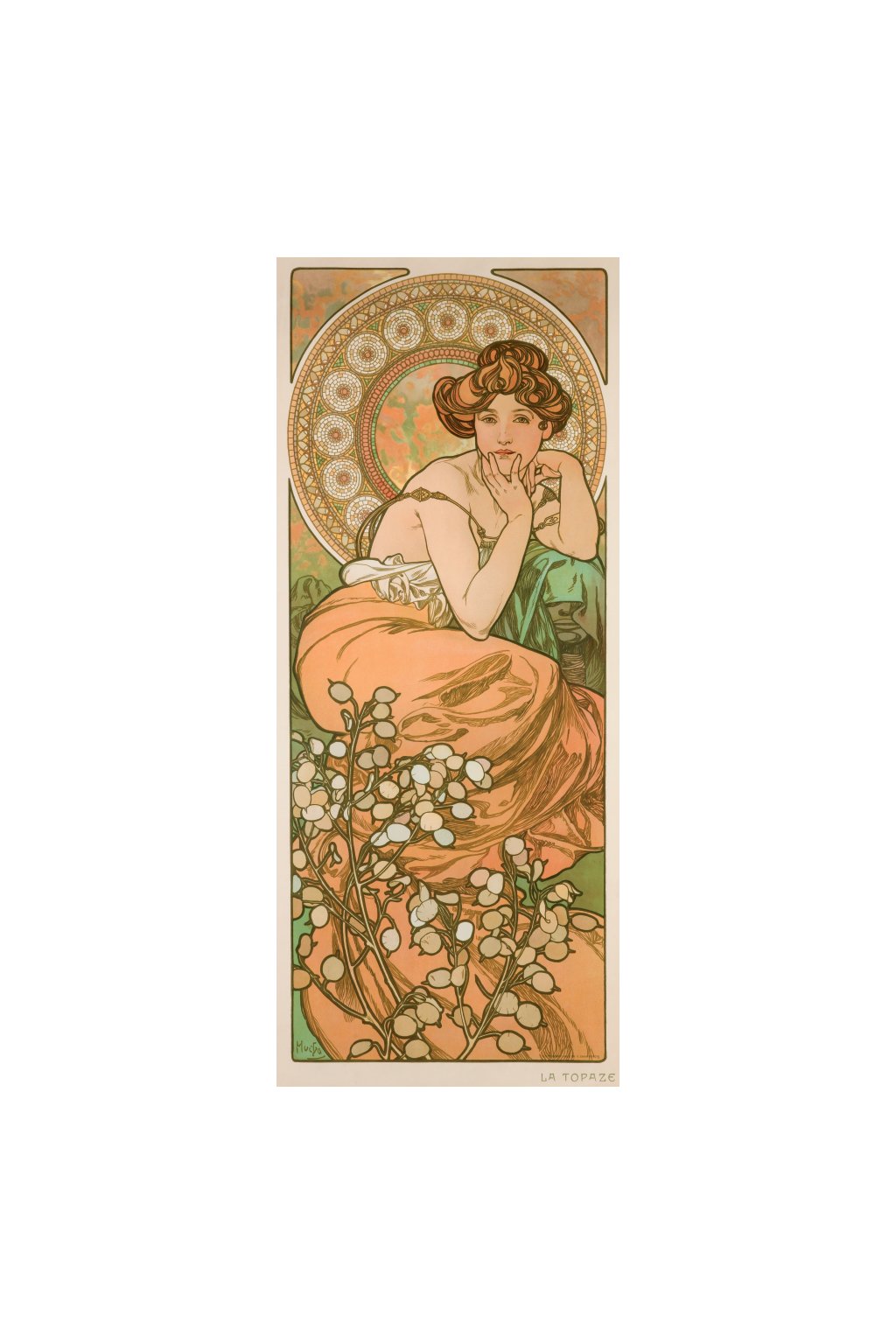 One of Mucha’s best sets, and one of the rarest ... Each gem is represented by a lovely lady, and its characteristic color, in all its hues, is worked into the entire pattern, including the girl's dress and the flowers at her feet.