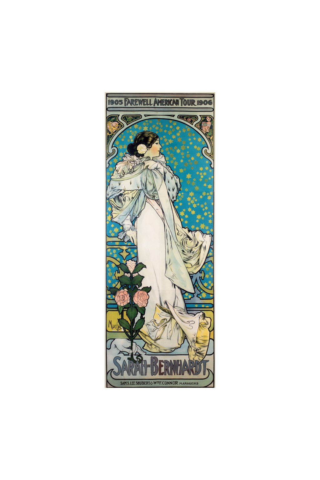 The second variant [of the Dame aux Camelias] shows no name of the play nor of any specific theatre. At top, it advertises the fact that this was to be Sarah Bernhardt’s farewell American tour, but this proved not to be accurate as she in fact returned in 1910, 1913 and 1916, by popular demand. At bottom, it gives the name of the actress and those of her tour coordinators in the U.S.